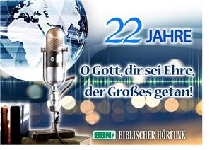 22 Jahre BBN Deutsch Internet Radio - Wir sind zutiefst dankbar für das Privileg, unseren deutschsprachigen Zuhörern in den vergangenen 22 Jahren biblische Ermutigung, Trost und Unterstützung bieten zu dürfen. Wir tun dies, indem wir Ihnen die Botschaft der Erlösung verkünden: Gott liebt Sie, er sandte seinen Sohn Jesus, um am Kreuz für Ihre Sünden zu sterben, und er hat einen besonderen Plan für Ihr Leben, in dem Sie Freude finden und ihm mit Ihrem Leben dienen können!