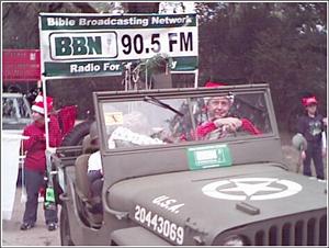 David Nichols, unser BBN-Repräsentant in Gainesville, Florida, hatte die Gelegenheit, am Weihnachtsumzug in Melrose, Florida, teilzunehmen. Ein Mann aus seiner Gemeinde lieh uns einen klassischen Militär-Jeep aus dem Jahre 1943, der uns als Festwagen diente. Hinten am Jeep brachten wir einen BBN-Banner an.
