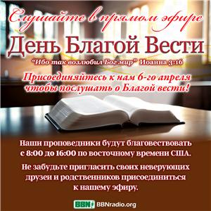 Наша история 2026 года очень похожа на Библейскую в том, что и сегодня многие люди погибают в полном отчаянии без средств на выживание и надежды на будущее. Поэтому мы, оказавшись теми, кому была открыта новость о несметных запасах благодати, и возможности жизни вечной на Небесах, хотим донести эту Радостную Весть другим. Поэтому в понедельник 6-го апреля, на BBN мы будем проводить день Евангелизации или ДЕНЬ БЛАГОЙ ВЕСТИ. В это время наши ведущие находясь в студии будут рассказывать о Спасении, чтобы донести Евангелие слушателям непосредственно через прямой эфир радио, а наши операторы будут в чате отвечать на вопросы.